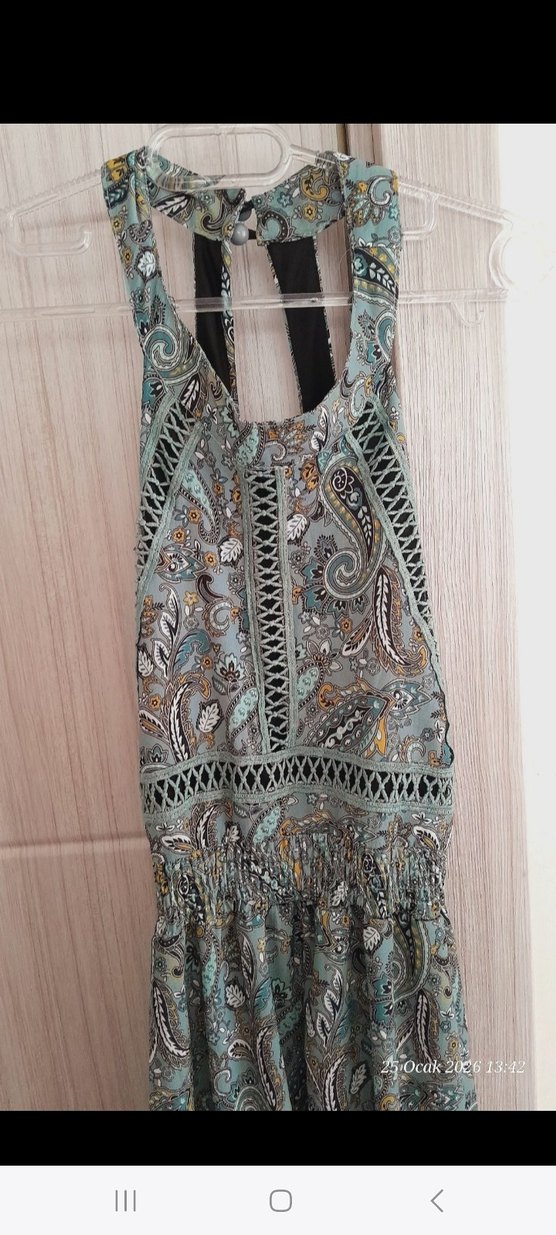 Ekol marka Kolsuz, yüksek yakalı uzun elbise, bol kesim ve kuşaklı. Turkuaz ve gri tonlarında bohem desenli kumaş.