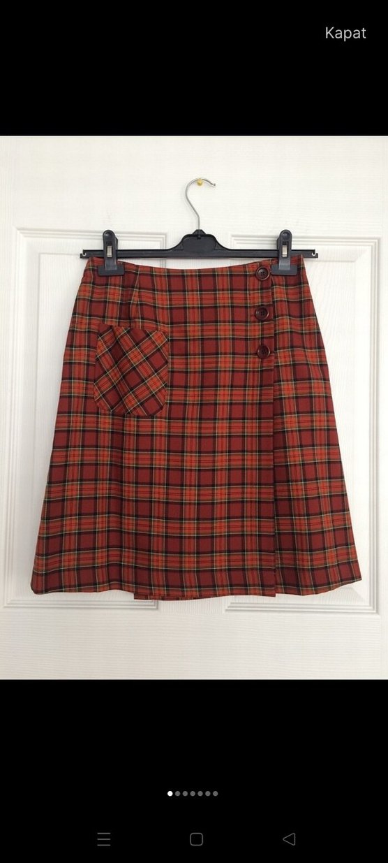 Ekol Etek markalı, ekose kabarma yapmaz kaliteli kışlık kumaştan, önden tek cepli ve 3 düğmeli çok şık hem spor hem fantezi kışlık etek. beli 70cm, içindeki düğmeye kadar 23 cm kumaş olduğundan bel ölçüsüne göre düğmenin yeri değiştirilerek daraltılıp, genişletilebilir. etek boyu 51 cm. hiç kullanılmıştır ve hiç bir sorunu kusuru yoktur.