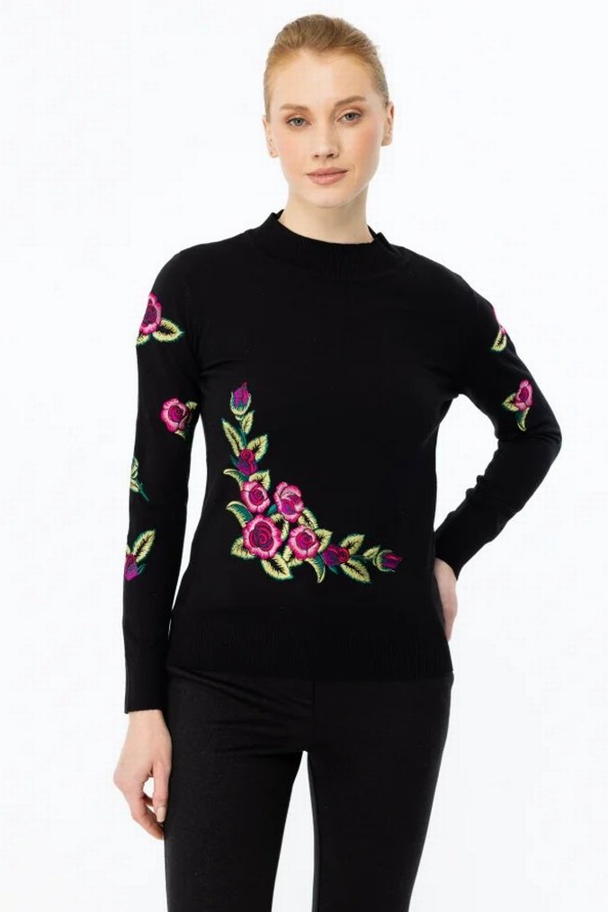 Dar kesim siyah triko kazak, uzun kollu ve yuvarlak yaka. Canlı çiçek nakışlarıyla günlük kullanıma uygun modern tarz. Yalnızca 2 kez giyilmiştir.