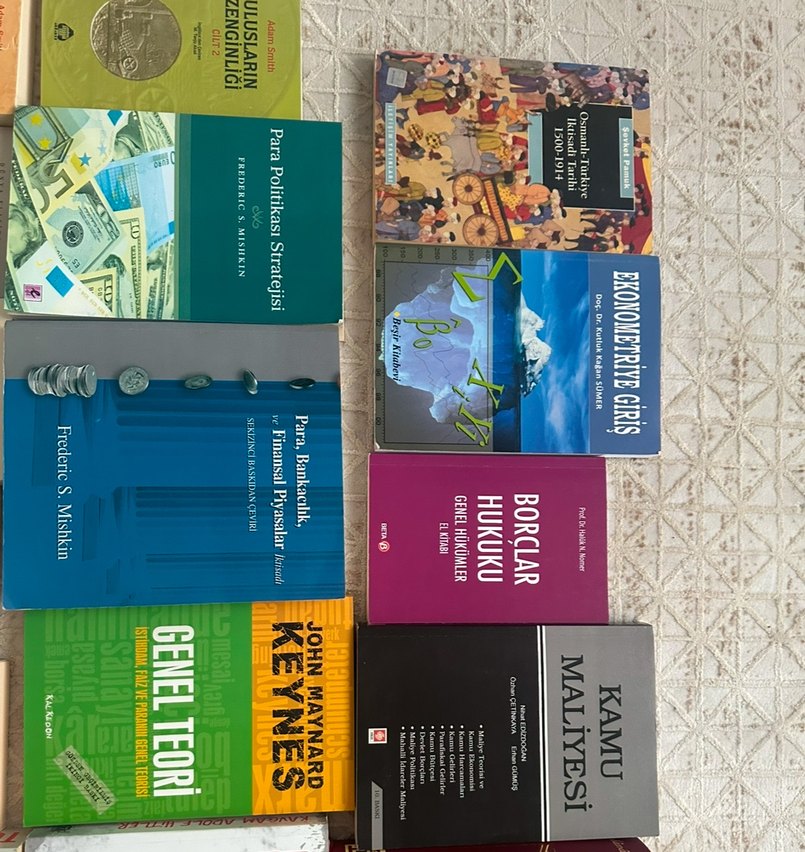 Hukuk, ekonomi, ekonometri, kamu maliyesi ve uluslararası ilişkiler gibi konuları içeren yabancı dil kitapları seti.