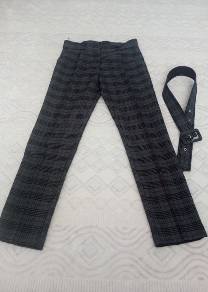 Kemerli gri ekose desen kışlık kalın kumaş pantolon