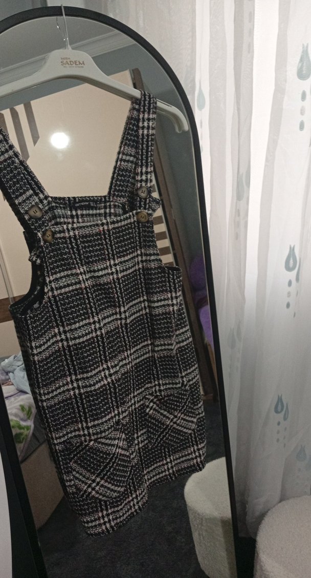 sadece bir kere giyildi Gri ekose desenli, askılı ve tokalı kayışlara sahip geniş kesim tulumu, yumuşak kumaştan üretilmiştir. Sokak stiline uygundur.