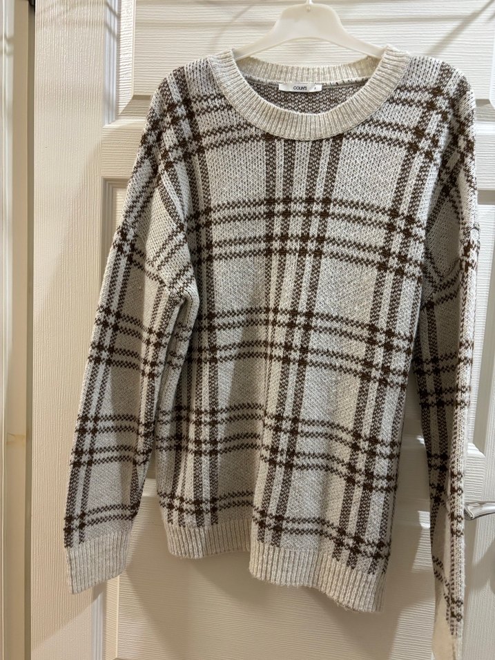 Bej renkte, ekose desenli örgü kazak. Uzun kollu, yuvarlak yaka ve bol kesim, midi boyda rahat bir model. 1 sefer giyildi. Popoyu kapatiyor.