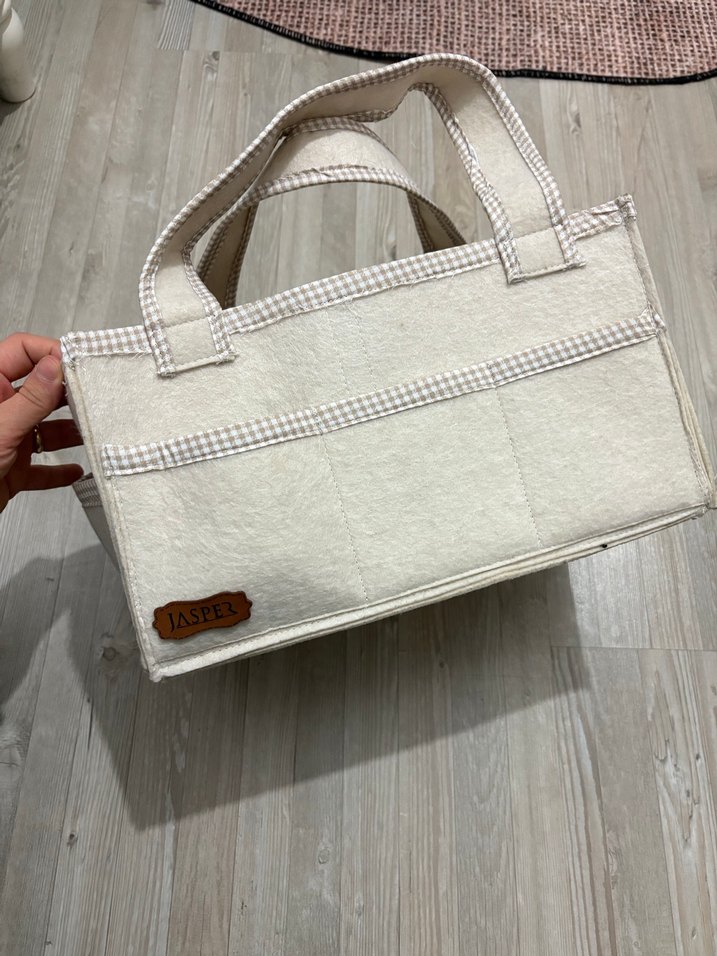 Ekose desenli, beyaz bebek çantası, sağlam sapları ve yumuşak dokusuyla kullanışlı depolama sağlar.