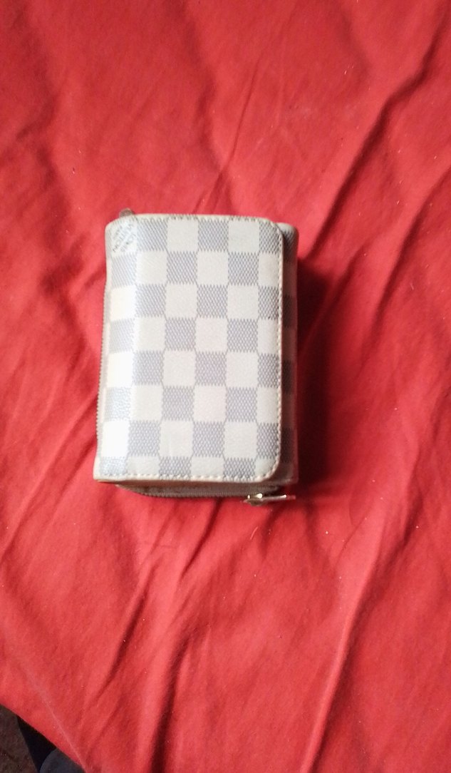Ekose desenli beyaz ve gri renklerde, fermuarlı kadın cüzdan. Sentetik kumaştan, günlük sokak stili için Paris esintili bir tasarım.