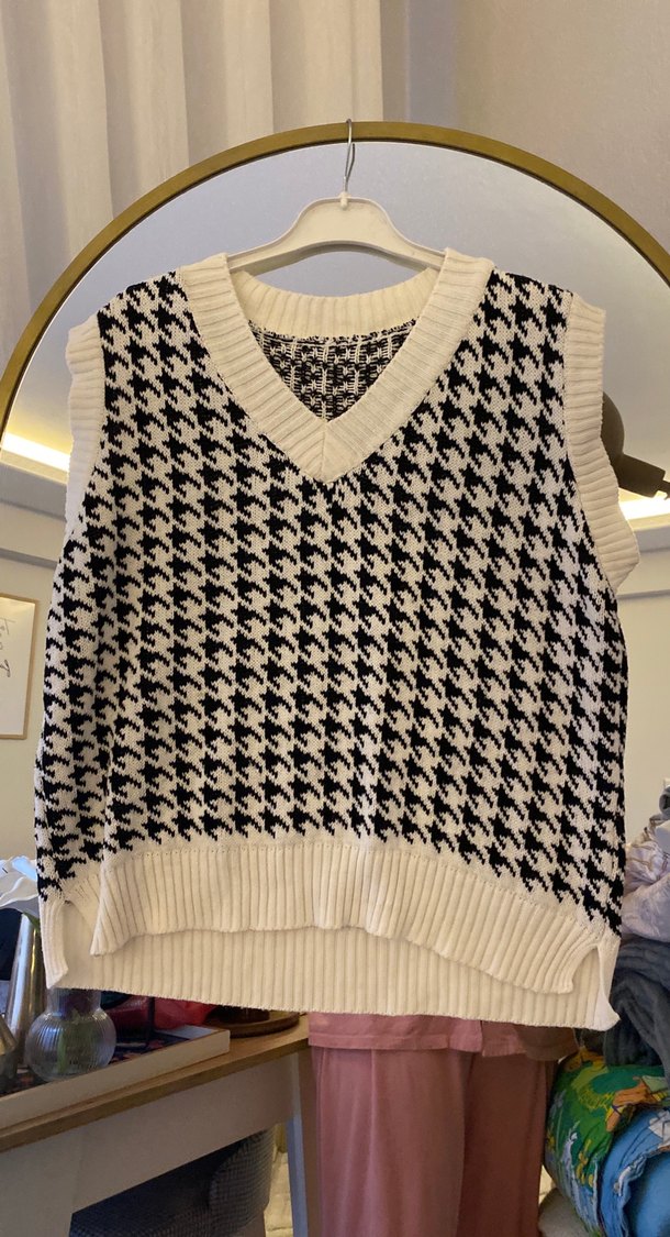Ekose desenli, beyaz ve gri renklerde, V yakalı ve kolsuz triko süveter. Rahat ve bol kesim, sokak stiline uygun.
