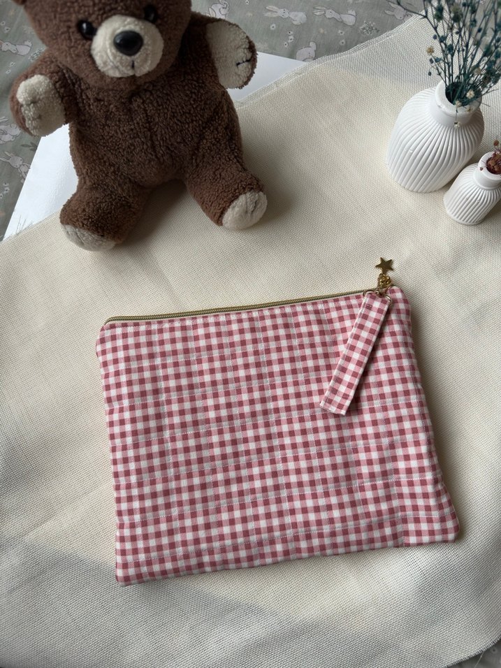 Bordo renkli ekose deseni ve fermuarlı kapanışı ile vintage tarzında makyaj çantası. Sentetik kumaştan üretilmiş, günlük kullanım için uygun ve rahat bir his sağlar.