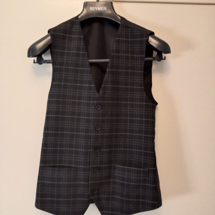 Özel dikim erkek yelek. Kumaşı, dikişi aksesuarari kalitelidir. Hiç kullanılmadı. İki kol altı arasi 45 cm boy 58 cm.dir, Notched lapel kesimli, gri ekose desenli, regular fit erkek yelek.
