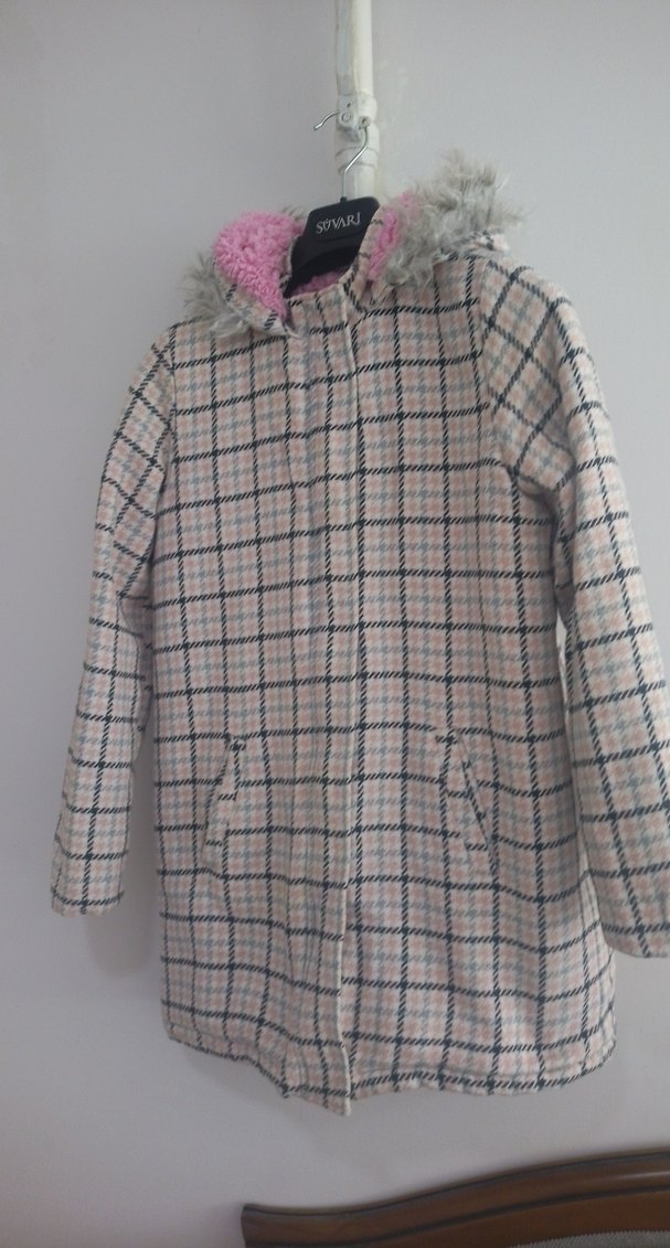 Gri ekose desenli kız montu, düğmeli ve kesik yakalıdır. Rahat kesim ve yumuşak, sıcak kumaşa sahiptir, gündelik kullanıma uygundur.