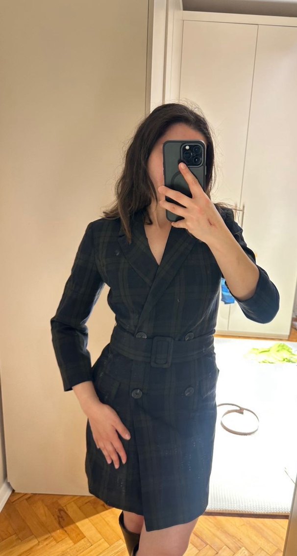 Düğmeli, kareli kadın iş takımı, normal boy midi uzunluğunda, uzun kollu ve regular fit. Sentetik kumaştan, notched lapel yakalı, ofis için uygun normcore tarzında.