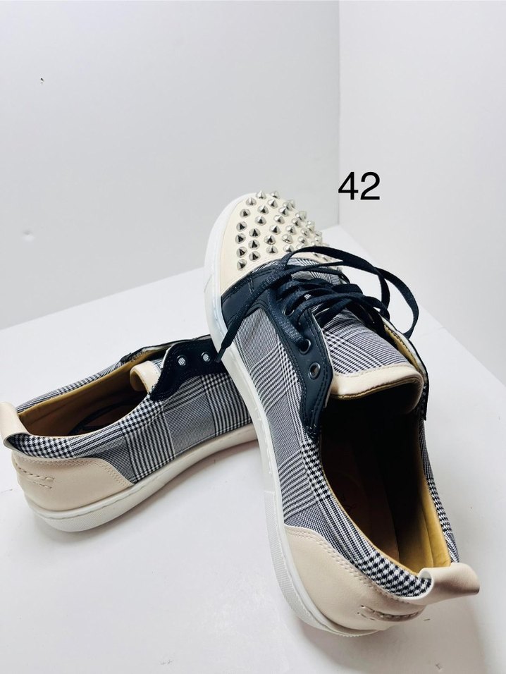 Gri ve beyaz ekose desenli, düğmeli detaylı ve kauçuk tabanlı erkek spor ayakkabısı. Günlük sokak stili için uygundur