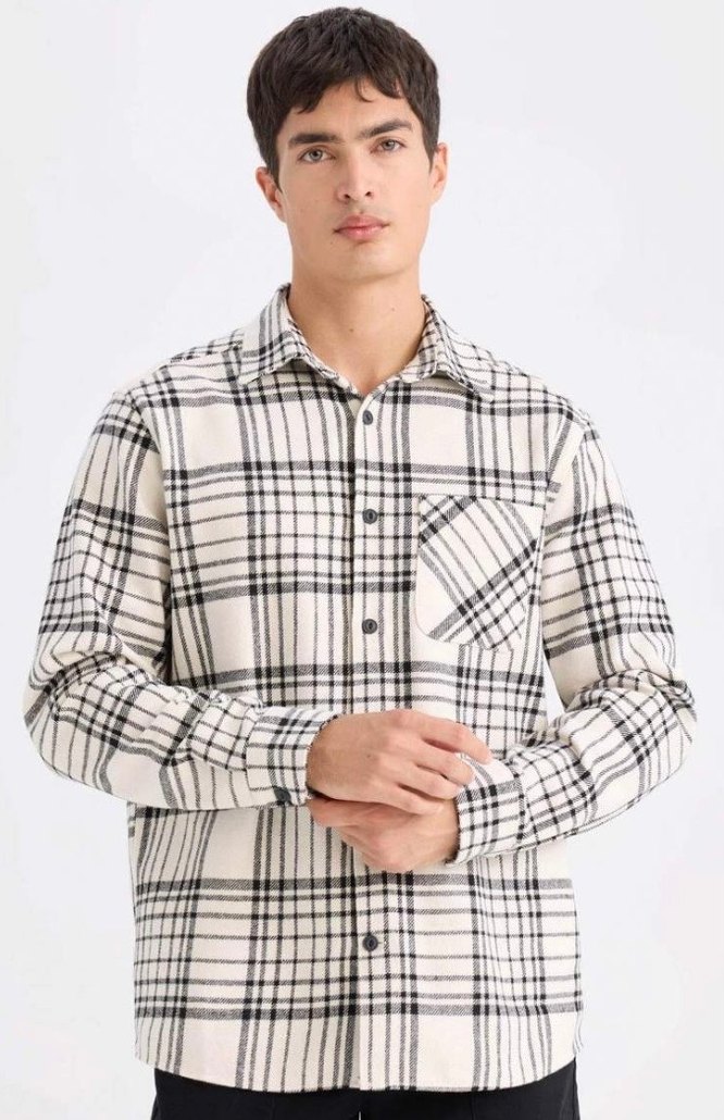 Pamuk kumaştan yapılmış, uzun kollu, yakalı ve düğmeli erkek gömleği. Beyaz ve gri ekose desenli, geniş kalıp günlük kullanım için uygundur. Yeni etiketli sıfır acil satılık‼️