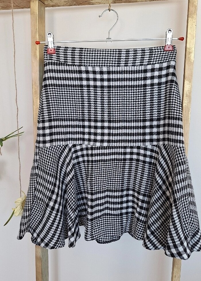 Ekose desenli, üstü oturan altı volanlı, diz boy etek. Az kullanıldı. Hiçbir kusuru yoktur.
