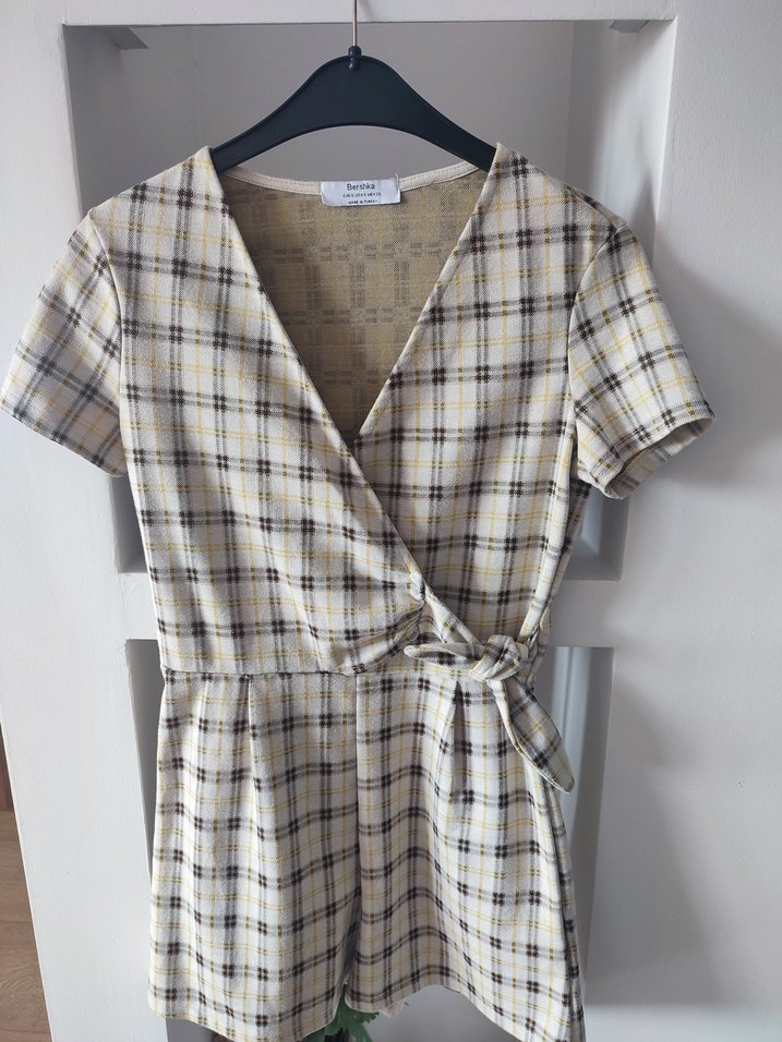 Bej ekose desenli mini tulum, V yaka ve kısa kollu tasarıma sahip, fiyonk bel detayıyla trend ve rahat bir görünüm sunar. Günlük kullanım için uygundur.