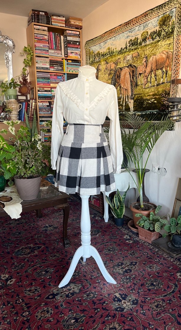 Gri beyaz ekose desenli, pamuklu mini etek, kemerli ve normal kesimdir. Vintage ve gotik tarzları bohem bir görünümle birleştirir. Ofis için , bel 40.5 cm boy 45 cm . Kışlıktır