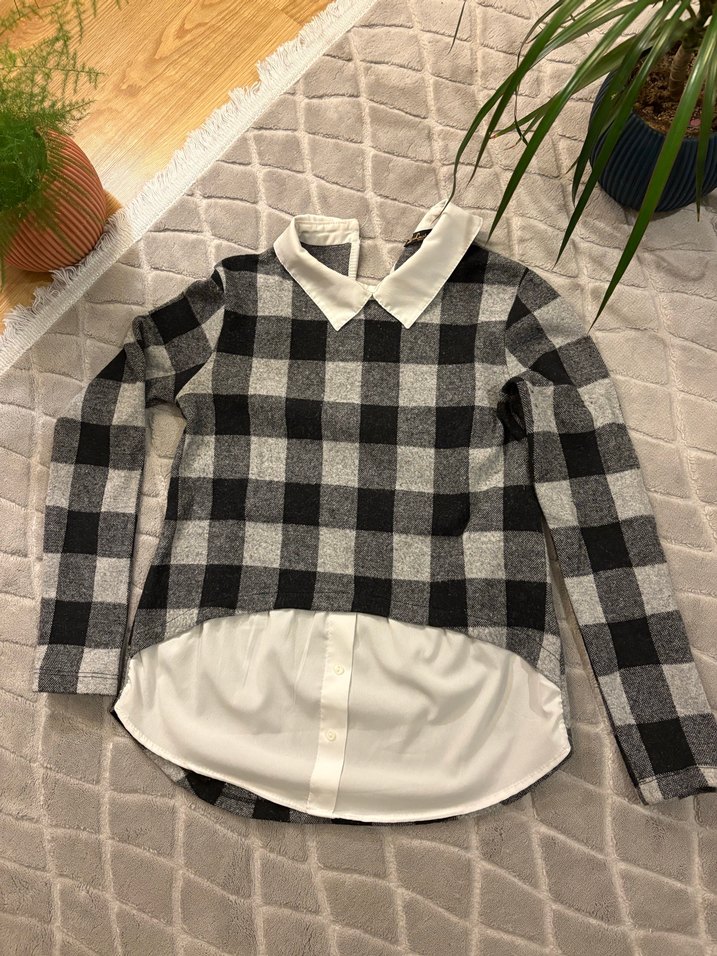 Uzun kollu, yakalı ve dar kesimli bluz. Gri ekose desenli, düğmeli ve katmanlı görünümlü, yumuşak sentetik kumaştan. Trendy sokak stili için uygun.