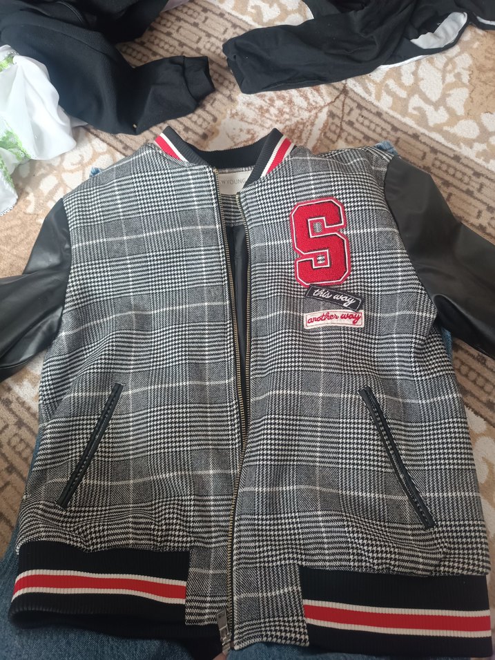 gri ekose desenli, sentetik kumaşlı ceket. Siyah kollu, çentikli yaka, fermuarlı cepler ve rahat kesimle günlük tarzda.