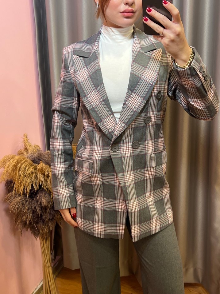 Ekose Desenli Gri Kadın Blazer Ceket S-M-L-XL