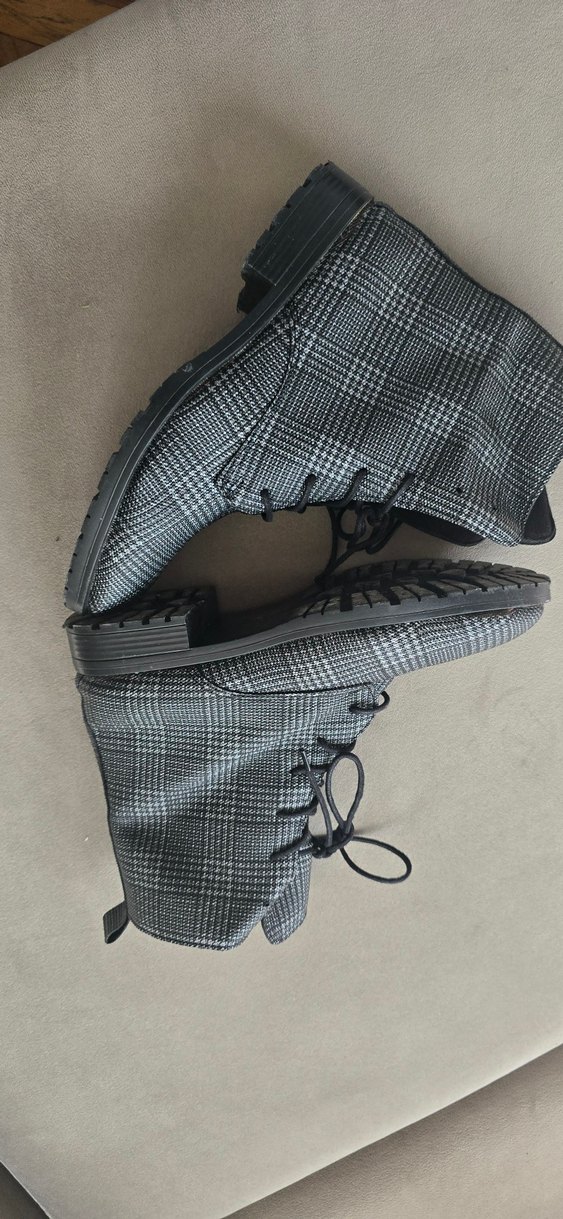 Ekose desenli gri kadın botları, sentetik kumaştan üretilmiş, stiletto topuklu ve tokalı detaylara sahip. Günlük sokak stiline uygun. sadece 1 kere giyilmistir