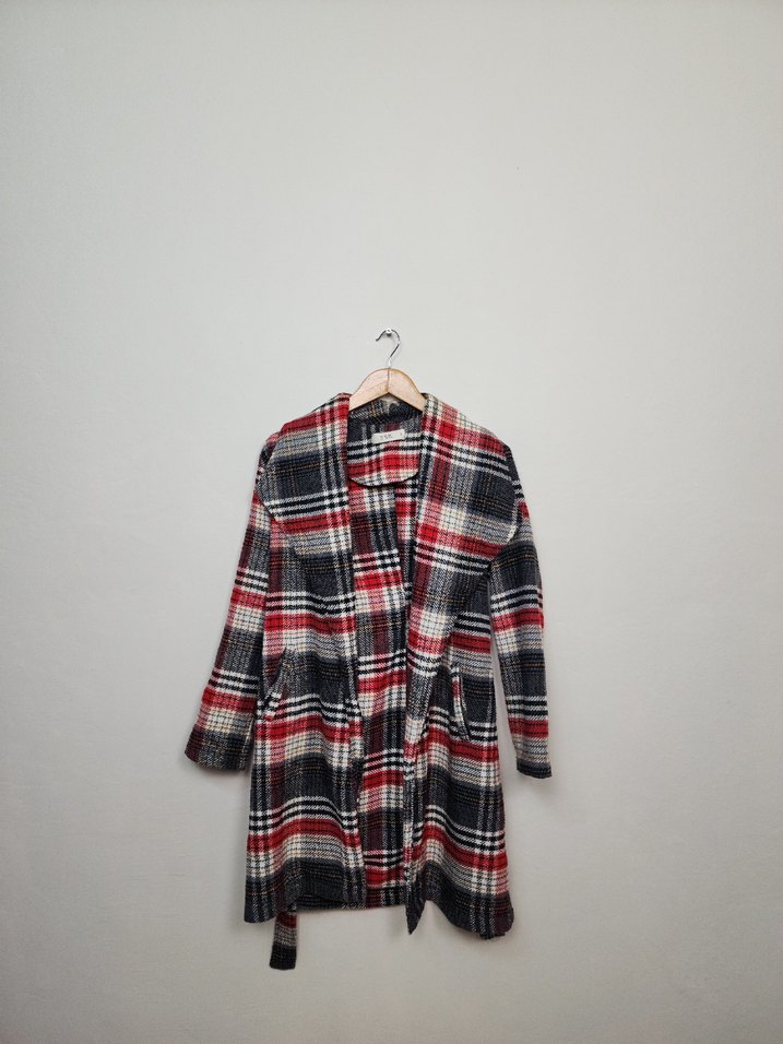 Gri ekose desenli, düğmeli ve uzun kollu kadın kabanı, rahat kesimi ve atkılı midi boyuyla günlük kullanıma uygundur.