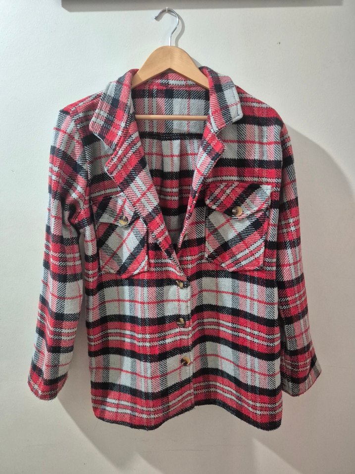 Ekose desenli, düğmeli ve uzun kollu kadın gömlek ceket. Rahat kesimi, kırmızı ve gri tonlarıyla günlük kullanıma uygun, yumuşak dokulu tekstil kumaşından yapılmıştır.