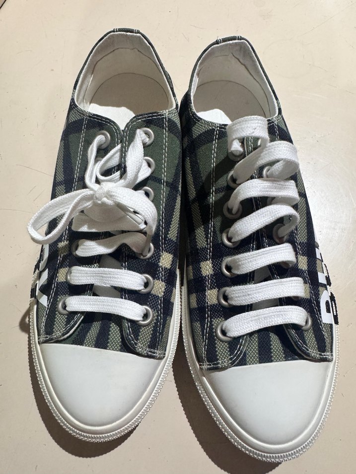 Yeşil ve gri ekose desenli, düz tabanlı kadın spor ayakkabısı. Beyaz bağcıklı ve tokalı, günlük rahat kullanım için uygundur.