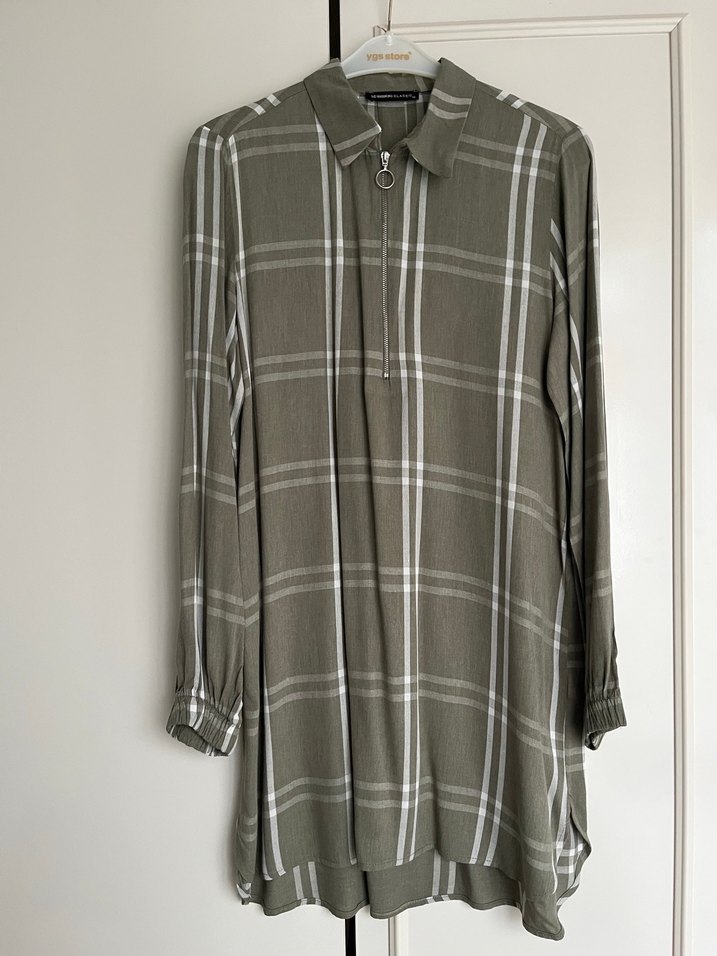 Haki renk tunik, fermuarlı ön ve ekose desenli, uzun kollu, yakalı, düz kesim gömlek. Günlük rahat kullanım için uygundur. Bir kez giyildi sorunsuzdur.