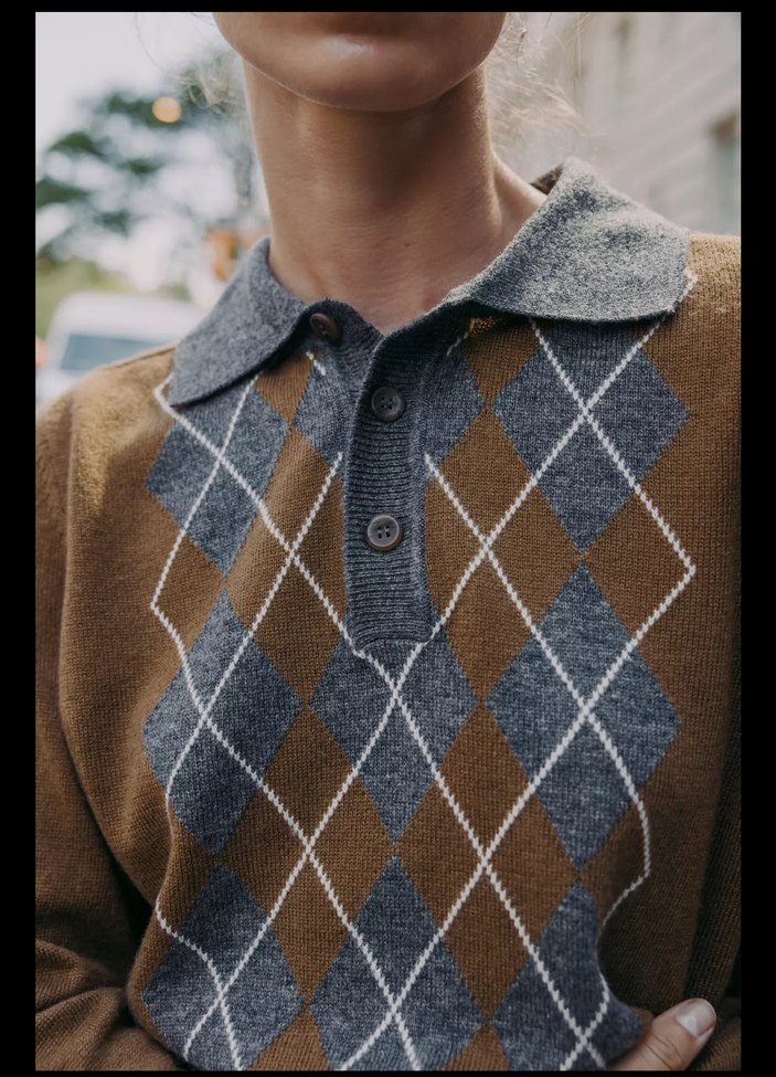 Kadınlar için yün, örme ve ekose desenli, kahverengi ve gri renklerde, yakalı ve uzun kollu rahat kesim kazak. Günlük ve vintage tarz için uygundur.