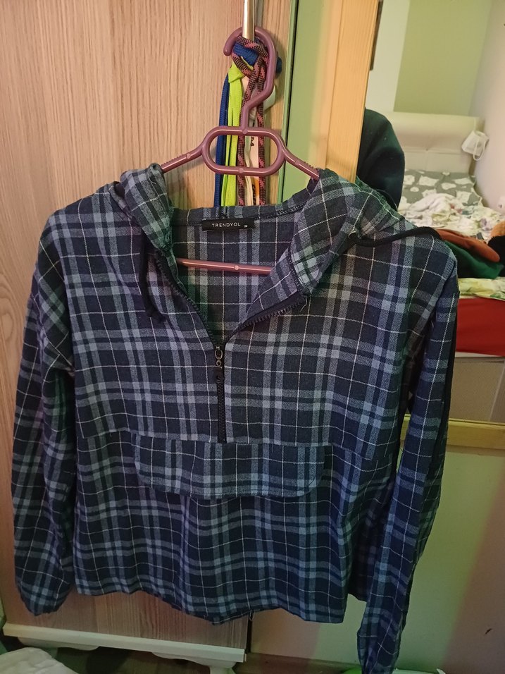 Kadın gömlek, uzun kollu, kapüşonlu fermuarlı ön detaylıdır. Rahat kesim ve normal boyda, koyu mavi ekose desenli, ince kumaştan üretilmiştir. Günlük kullanıma uygundur. gömlek kumaşı ince