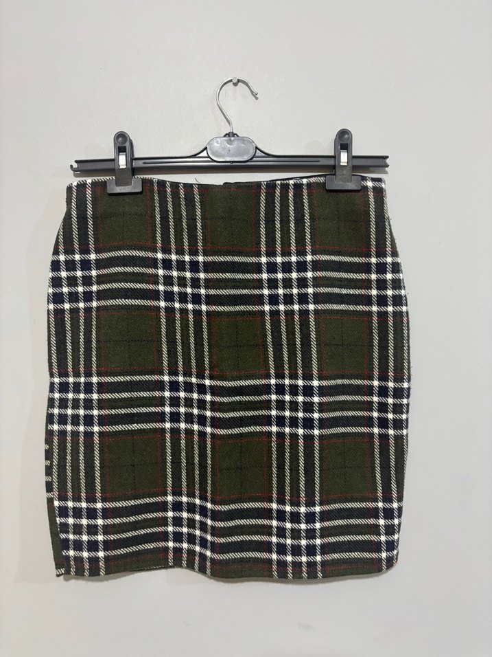 Sentetik kumaştan yapılmış, ekose desenli yeşil-gri fitted midi mini etek. Günlük sokak stili için uygundur.