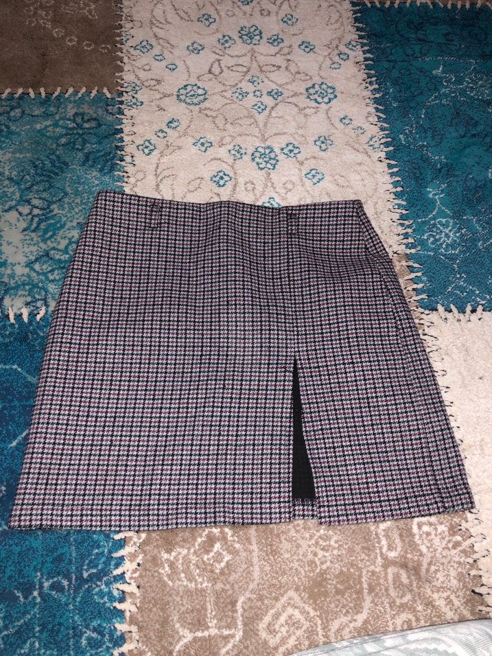 Çok renkli ekose deseni ve ön yırtmaçlı, dar kesim mini etek. Sokak stili ve Parisli retro havası taşıyan bohem bir tasarım.