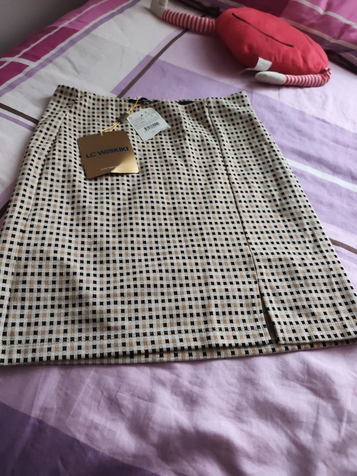 Bej renkli, ekose desenli ve sentetik kumaştan yapılmış mini etek. Rahat kesimiyle gündelik kullanıma uygun, trend sokak stili yansıtıyor.