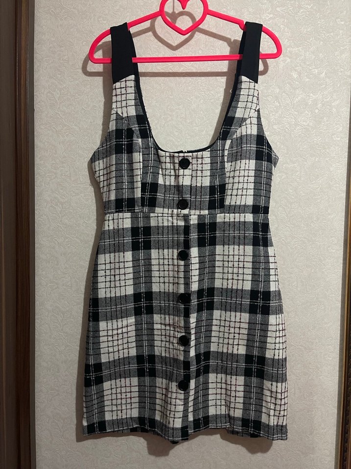 Siyah askılı, önü düğmeli, ekose desenli, mini boy jile kadın elbisesi. Rahat ve günlük kullanıma uygun. #ekose #minielbise #askılıelbise #düğmelielbise #günlükkelbise #şık #kadıngiyim