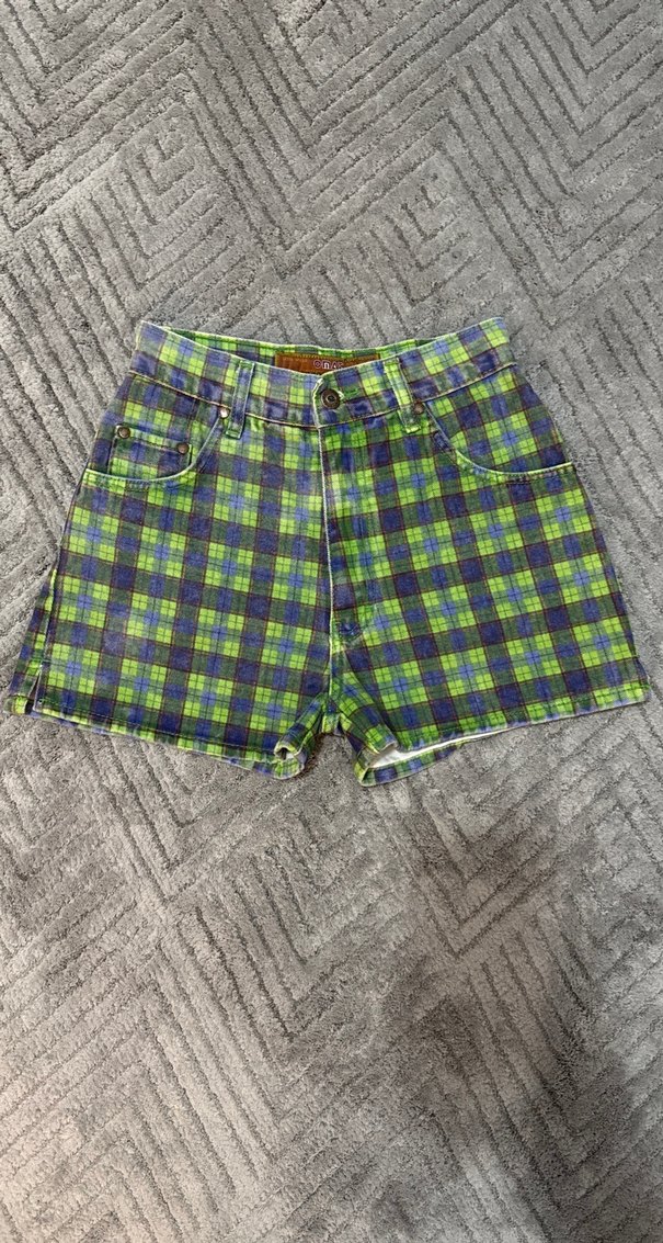 34-36 bedene uyumlu beli tam oturur aşağıya doğru bol kesim kot mini şort, yeşil-mavi ekose desenli, günlük kullanıma uygun grunge punk tarzı. %100 pamuk deforme yoktur Bel 33 cm Boy 34,5 cm