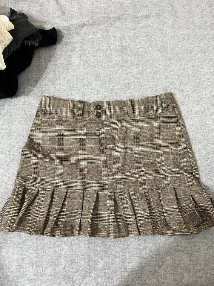 Bu kahverengi ekose desenli midi etek, pilili ve bol kesimdir, sentetik kumaştan yapılmıştır. Trendy günlük sokak stili için uygundur.