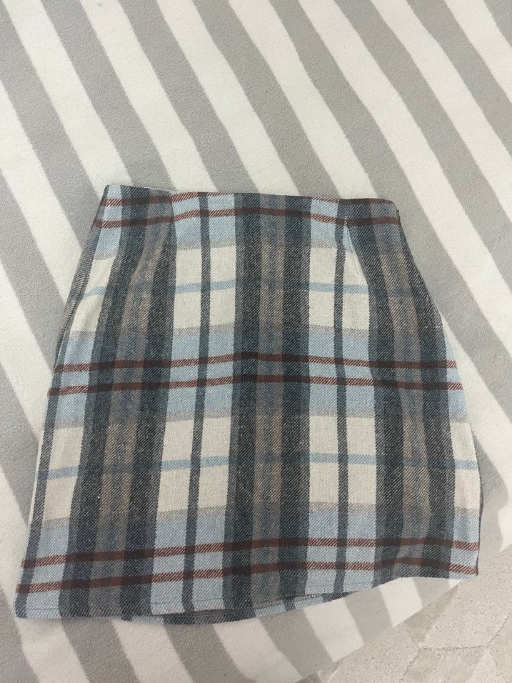 Bej ve gri tonlarında ekose desenli, pliseli ve vücuda oturan midi etek, yumuşak sentetik kumaştan üretilmiştir. Günlük sokak stili için uygundur.
