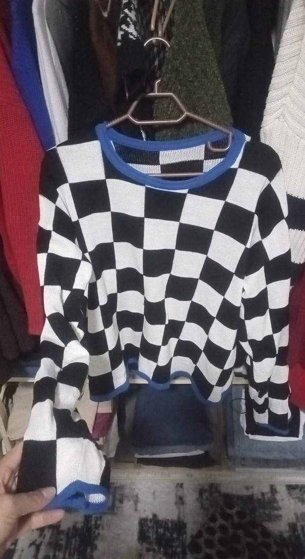 Kadın trikosunda uzun kollu, ekose desenli, yuvarlak yakalı, bol kesim ve normal boyda, sentetik kumaştan örülmüş rahat bir parça yer alıyor.