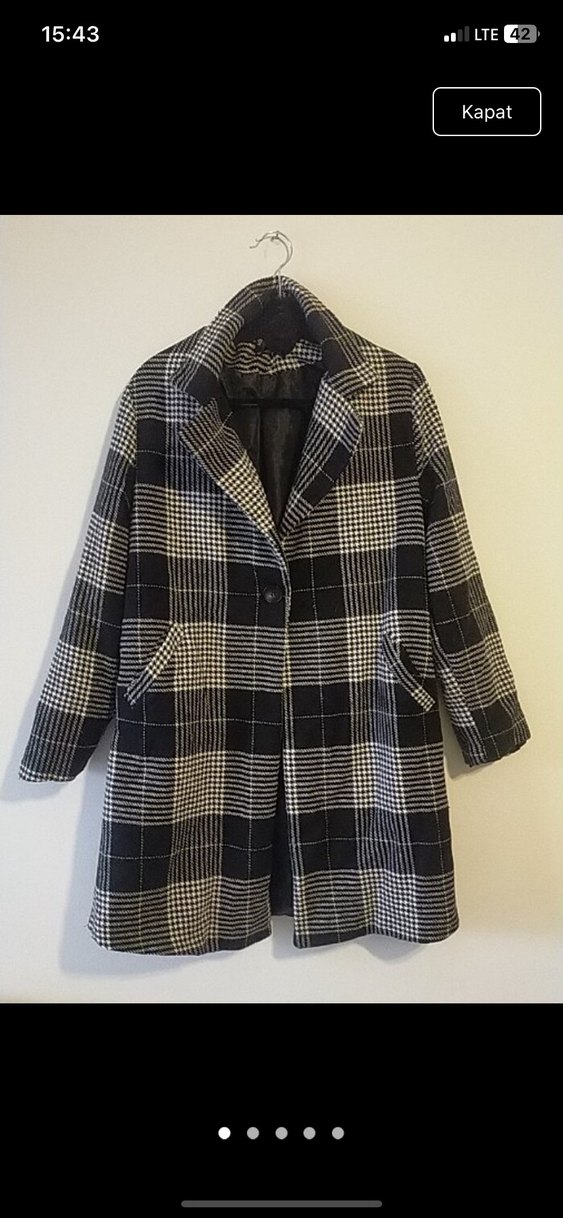 Tek düğmeli, iki cepli siyah beyaz ekose desenli kaban. Klasik yakalı ve soğuk havalar için sıcak tutan yumuşak dokuda.