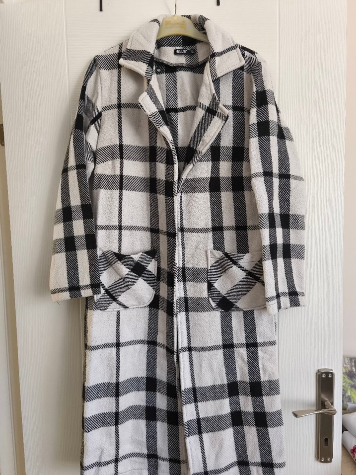 siyah renkte, ekose desenli, uzun kollu kadın kabanı. Rahat kesimli, günlük sokak stiline uygun. hafif tülermesi mevcut fotoğrafta göründüğü gibi