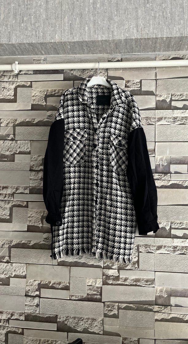 Uzun ve bol kesim kadın gömlek, ekose desenli olup siyah kollara ve çentikli yaka detayına sahiptir. Düğmeli manşetleri ve püsküllü alt ucu vardır.