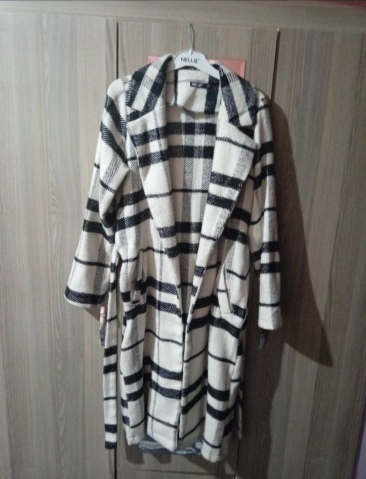 Uzun, bol kesim kadın kaban, düğmeli ve kesik yakalıdır. Yumuşak ve sıcak kumaştan yapılmış, beyaz ve gri ekose desenlidir, trend sokak stili için uygundur.