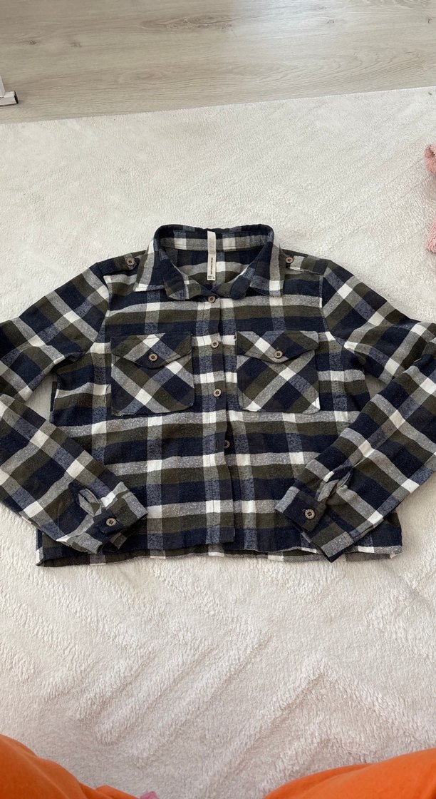 ekose desenli, pamuklu kumaştan, notlu yaka ve düğmeli, boyu kısa ve uzun kollu gömlek. Rahat sokak stili için uygundur.