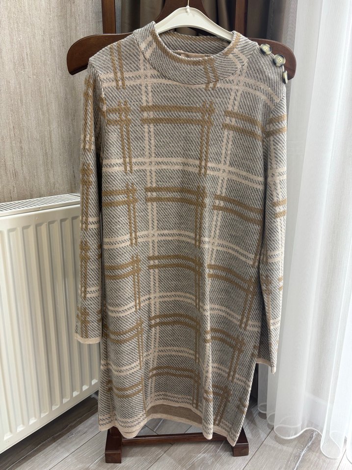 Uzun boy, ekose desenli kahverengi ve gri tonlarda triko kazak. Bisiklet yaka, uzun kollu ve regular fit, modern klasik tarzı yansıtır. Rahat ve şık bir tercih.
