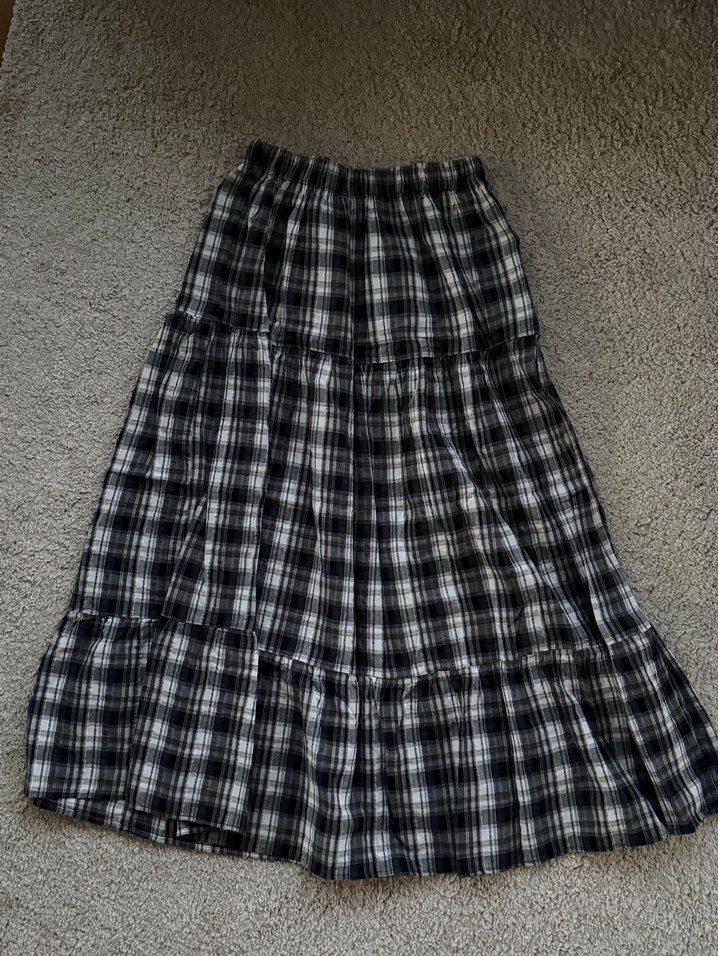 Uzun, bol kesim pilili etek, koyu gri ekose desenlidir. Sentetik kumaştan üretilmiş olup bohem ve retro tarzına uygundur.