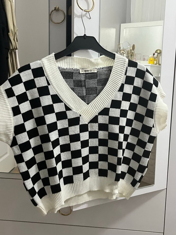 Bu kolsuz triko süveter, beyaz ve gri ekose desene sahip, bol kesim ve V yaka detaylıdır. Günlük rahat stil için uygundur.