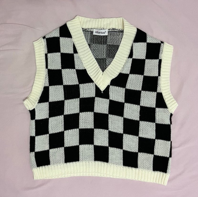 Siyah beyaz ekose desenli, V yaka ve kolsuz örgü süveter. Rahat kesimiyle günlük ve sokak stiline uygun.