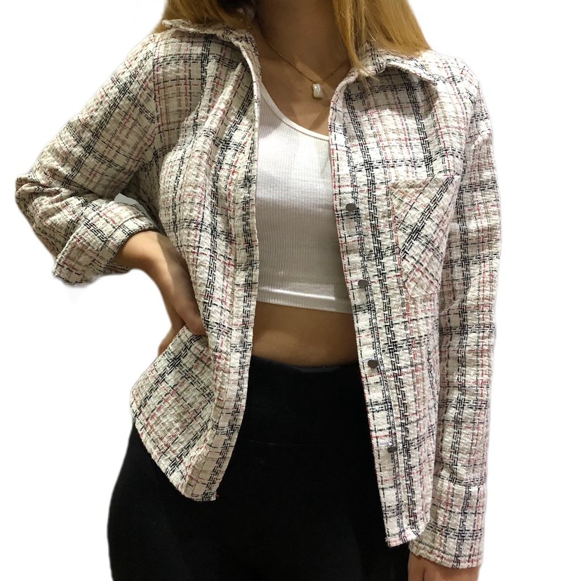 Düğmeli, beyaz ekose desenli gömlek, notlu yaka ve uzun kollu. Sentetik kumaştan, normal kesim günlük kullanıma uygun. S-M-L bedenleri mevcuttur