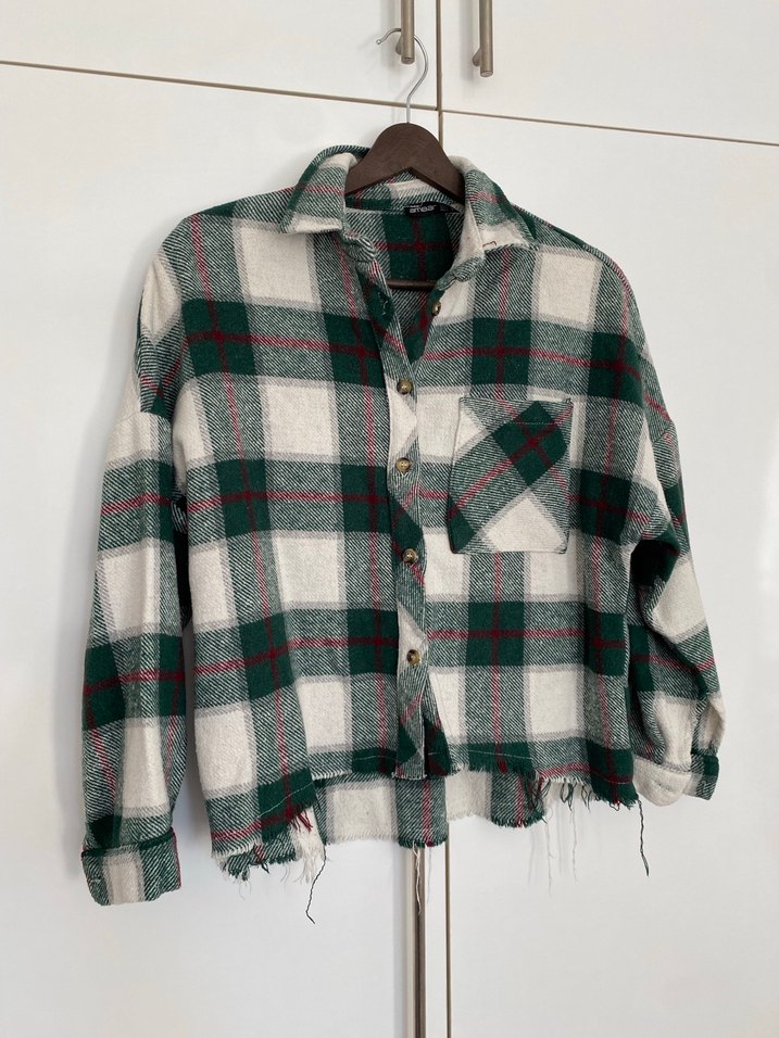 Düğmeli, uzun kollu, yeşil ekose desenli kadın gömlek. Yumuşak yün kumaştan, normal midi boyda, rahat kesim. Günlük kullanıma uygun.