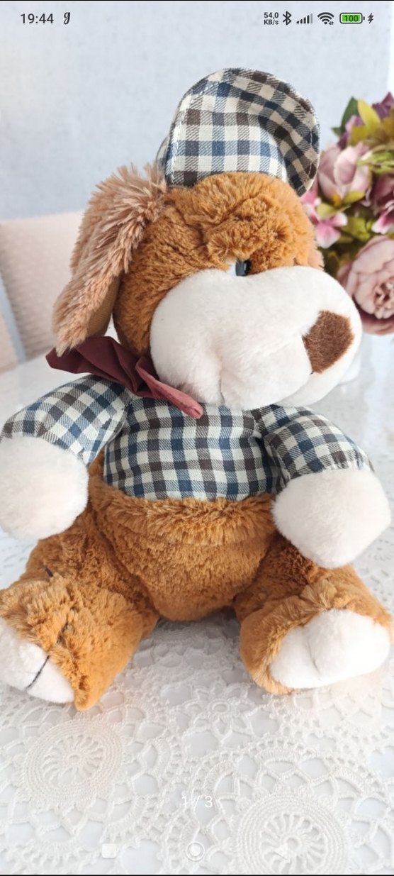 Yumuşak kahverengi peluş köpek, ekose desenli renkli kıyafet ve şapka ile, boynunda bordo fiyonk ile süslenmiş.
