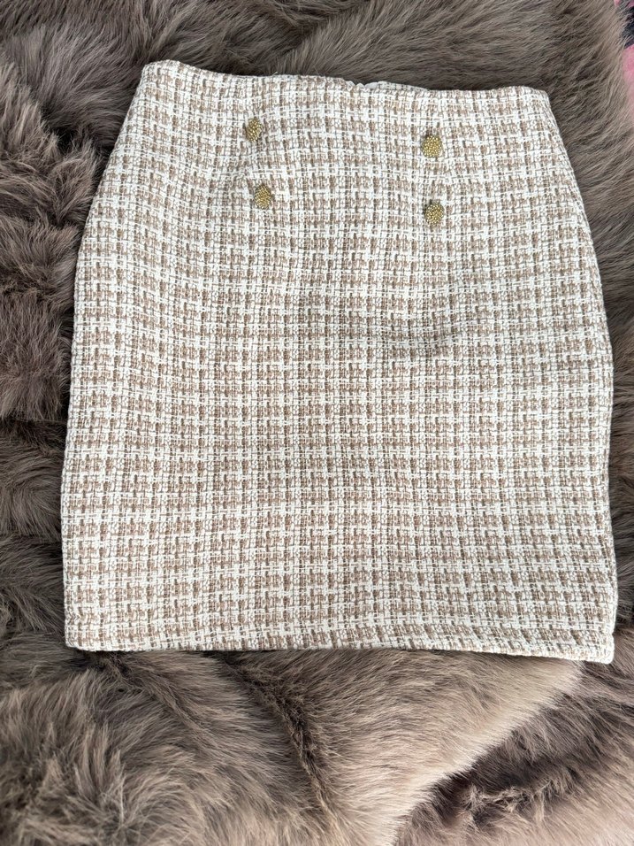 bej ekose midi etek. Sentetik kumaştan, regular fit ve önünde düğmeler bulunur, rahat sokak stili için uygun.